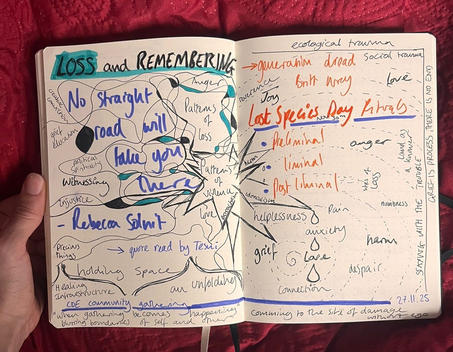 She founded the transnational ecogrief collective, Foreshadowing, after finding it too deeply painful to spend time in these damaged places, and needing not individualised therapy, but a collective witnessing, understanding and holding.