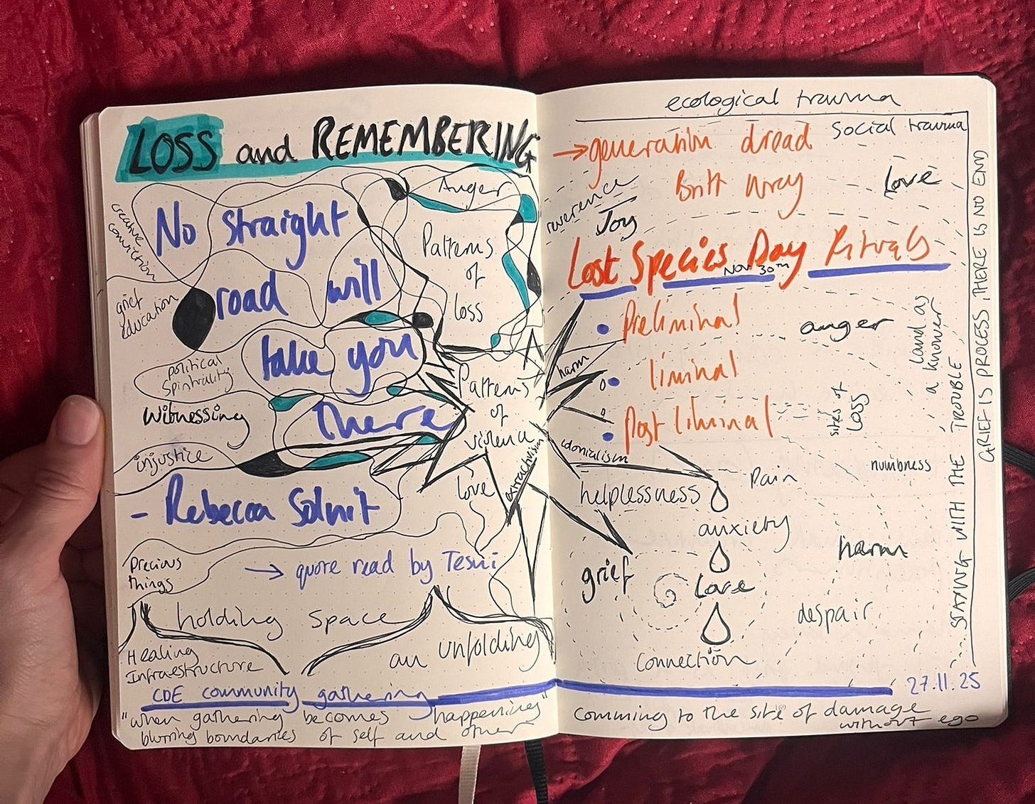During our Breakfast, Persephone Pearl shared the story of Lost Species Day which they co-founded in 2011 after sensing that ‘loss was not evident in the political discourses surrounding climate, but was felt in our bodies and our bones.’ Beautiful imagery was shared of ceremonies, funerals, memorial sites and life cairns - contemplative spaces that allow us to say goodbye. Persephone spoke to the imperfectness of carrying Lost Species Day through the years, and the imperfectness of grief as an ongoing process.